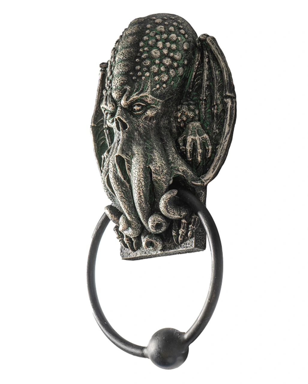 Der Cthulhu Türklopfer zeigt das mystische Wesen des Cthulhu. Der aus Polyresin gegossene und von Hand bemalte Door Knocker sieht aus wie ein böse guckender Oktopus Schädel, der nicht von dieser Welt stammt. Zu allem unheimlichen Überfluss besitzt das Ding auch noch Fledermausflügel. Der Ring dieses genialen H.P. Lovecraft Fanartikels ist aus Metall. Er eignet sich natürlich auch fantastisch als Halloween Türklopfer.