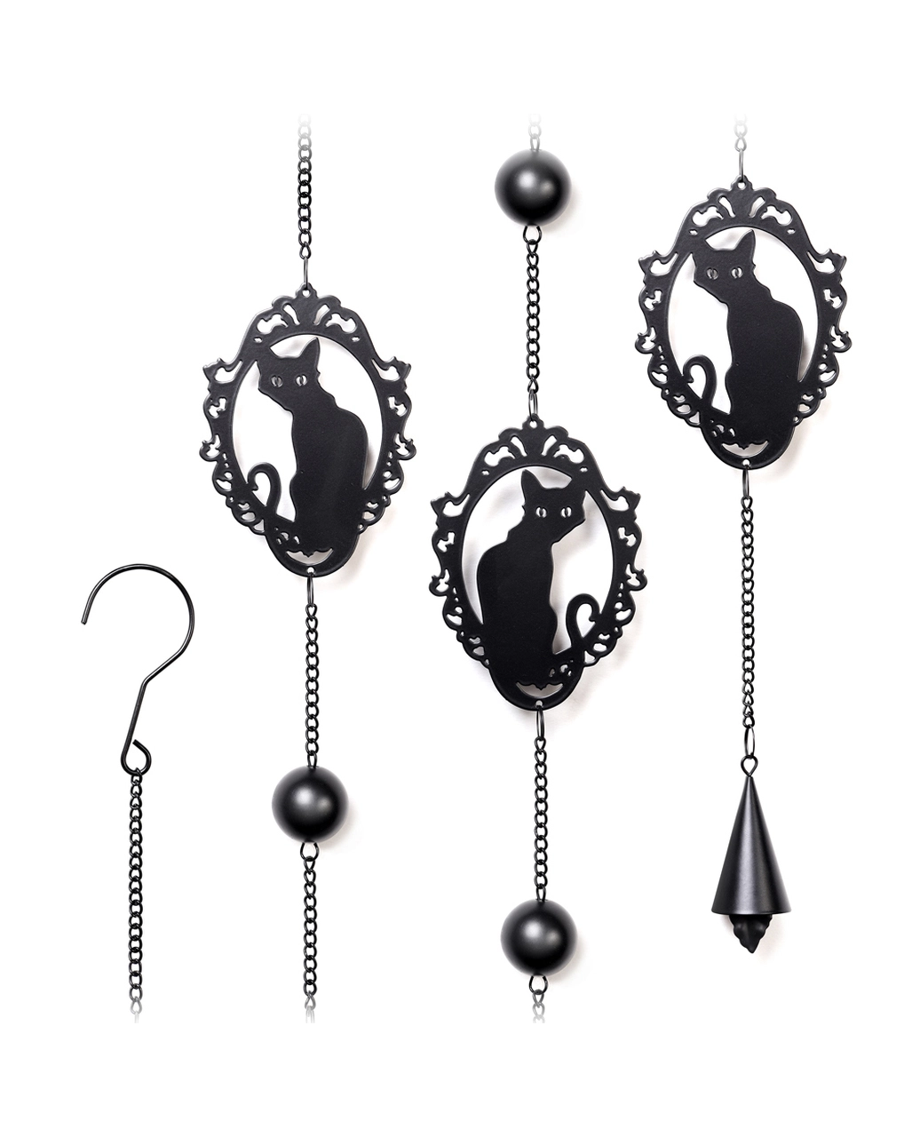 Windspiele sind oftmals an Eingangstüren und auf Balkonen anzutreffen. Sie dienen nicht nur der Bestimmung der Windrichtung, sondern sollen sich durch ihren harmonischen Klang auch positiv auf das Wohlbefinden auswirken. Mit unserem Katzen Silhouette Metall Windspiel als Hängedeko schmückst du deinen Außenbereich im Katzen Look. Das Halloween Windspiel zeigt aneinander aufgereihte Kätzchen, die über ihre Schulter schauen. Nutze das Windspiel als Gothic Wohnaccessoire für den Innenbereich oder als stimmungsvolle Halloween Außendeko.