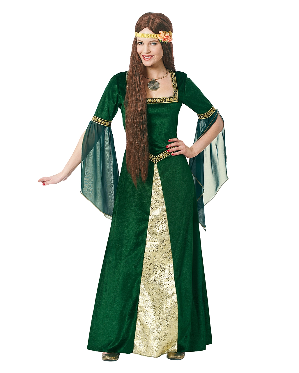 Das Renaissance Lady Kostüm ist ein bodenlanges Abendkleid mit raffinierten Schnitten und Applikationen, die dich optisch sogar schlanker machen. Das grüne edle Burgfräulein Kostüm in Samt-Optik hat lange Chiffon-Trompetenärmel und goldene Bordüren als Verzierung am Kragen, an der Taille und an den Ärmeln. Der Rockteil wurde in seiner Mitte mit einem besonders schön verzierten Einsatz in Gold aufgepeppt. Zum edlen Burgfräulein Kostüm gehört noch ein goldenes Haarband mit rosafarbenen Blumen. Als Accessoire für dein historisches Outfit haben wir noch eine Renaissance Perücke braun Deluxe im Angebot um dein Kostüm zu komplettieren!