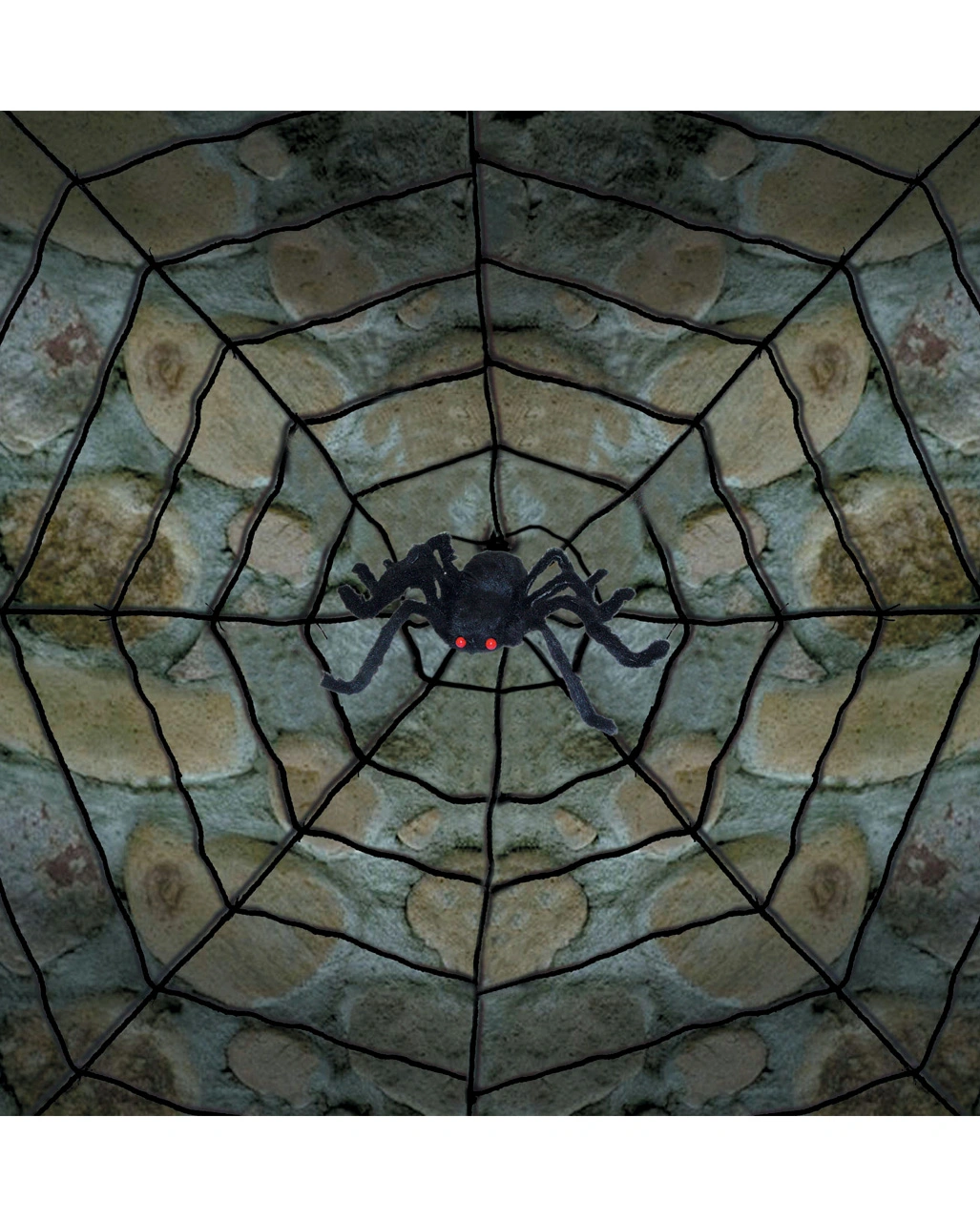 Das Riesen Spinnennet besteht aus schwarzem Seil und hat einen Durchmesser von ca. 300 cm. In der Mitte des Spinnennetz sitzt eine lauernde, haarige Spinne. Zusammen mit Graue Steinwand Folie dekorierst du dir damit für deine Halloween Party ein unheimlich aussehendes Gewölbe.
