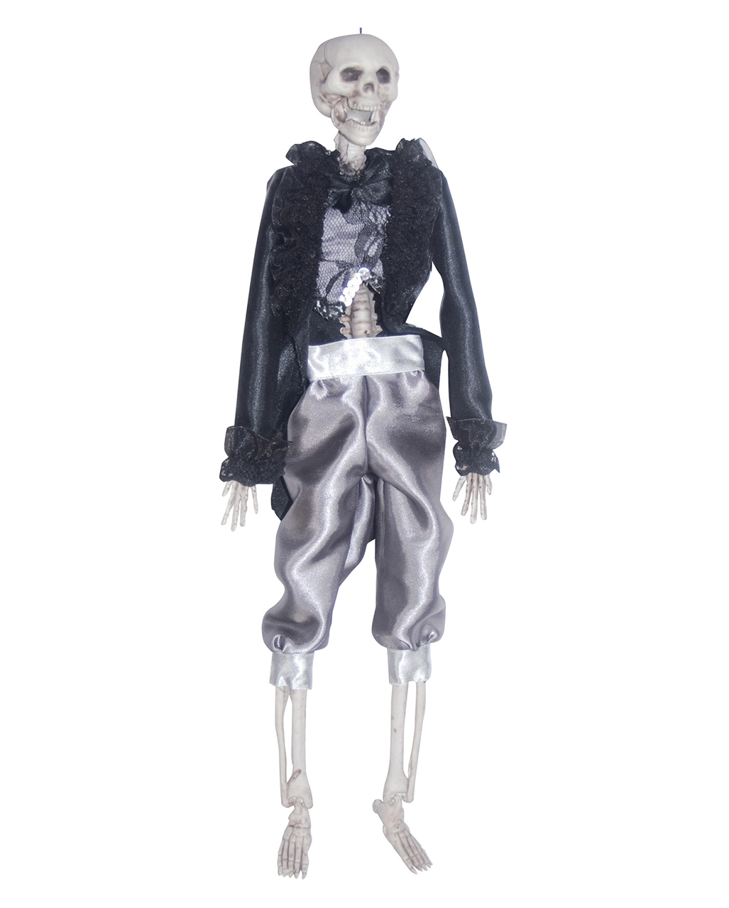Auch Skelette können heiraten. Dafür erhalten sie sogar eigenes zugeschnittene Kleidung. Der Schwarze Knöcherne Bräutigam ließ sich nicht lumpen und hat sich direkt eine schicke silberne Hose schneidern lassen. Dazu trägt er über seinen Rippen ein silbernes Hemd mit einem schwarzen Muster und Fliege. Passend zur Fliege trägt er einen Frack mit Rüschen am Revers und an dem Ärmeln. Der Schwarze Knöcherne Bräutigam hängt nicht nur rum, sondern kann auch sitzen. Zum Beispiel auf deiner Tischkante oder deinem Kleiderschrank – eben da, wo du ihn brauchst.