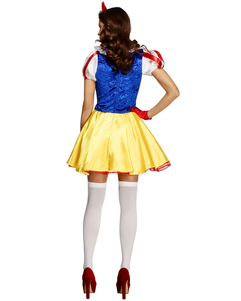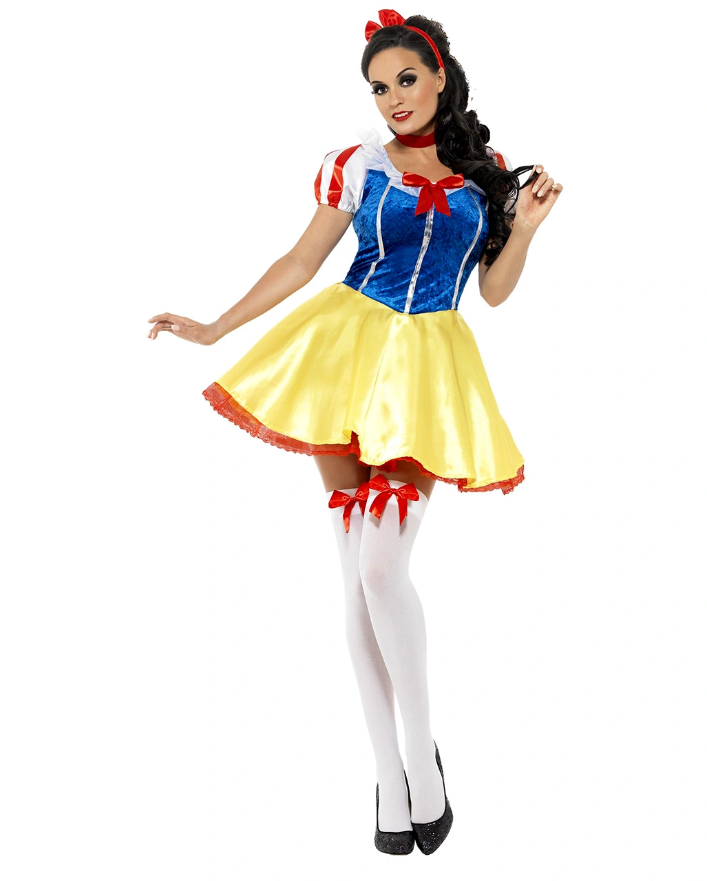 Schneewittchen als süße Unschuld, das war gestern. Schließlich wirst Du mit dem Sexy Schneewittchen Kostüm mit Petticoat dafür sorgen, dass Dir alle Typen zu Füßen liegen. Das Kostüm besteht aus einem toll gearbeiteten Kostümkleid, das zwar die typischen Farben der Disney Prinzessin in Blau und Gelb aufweist, aber zu sexy für brave Mädchen ist. Das blaue Oberteil wurde mit hübscher Spitze am Ausschnitt und einer roten Schleife aufgepeppt. Durch seine Korsagenoptik zaubert das Kleid eine schlanke Taille. Der kurze gelbe Rock lässt viel Beinfreiheit, der Petticoat wippt lässig im Takt, wenn Du Dich als heiße Märchenbraut in den Mittelpunkt tanzt. Der Haarreifen mit der roten Schleife rundet als stilechtes Detail das Gesamtbild der Märchenfigur ab. Passend dazu würden Dir die Weisse Kniestrümpfe mit Schleife gut stehen.