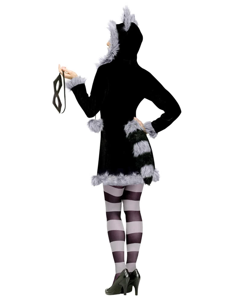 Das Raccoon Kostüm für die Dame ist ein kurzes schwarzes Minikleid aus schwarzem samtähnlichen Stoff mit grauem Kunstfellbesatz an den Säumen. Der gestreifte Schwanz wird über eine Öse einfach am Kleid eingehängt. Die schwarze Waschbärenmütze mit Ohren und Bommeln und die schwarze Augenmaske runden das Waschbär Kostüm ab. Passend dazu gibt es noch die gestreifte Nylon-Strumpfhose im gleichen Farbton schwarz-grau. Die Mary Jane Pumps schwarz Gr.38/39 und Schwarze Pumps mit Nieten sind optimale Accessoires zu dem sexy Waschbär Kostüm.