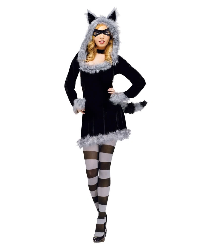 - Inhalt: 5-teiliges Kostüm Set aus Minikleid mit integriertem Halsband, Waschbärschwanz zum Einhängen, Waschbärenmütze mit Ohren und Bommeln, Schwarz-Grau gestreifte Nylon-Strumpfhose, Waschbären Augenmaske