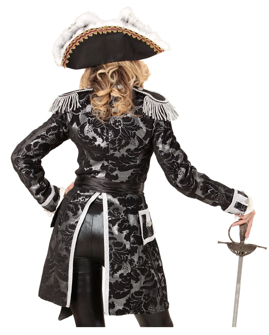 Der silbern-schwarze venezianische Damenfrack ist aus schwerem Stoff gearbeitet und besitzt ein wunderschönes florales Muster aus silberner Stickerei auf schwarzem Stoff. Die Verzierung aus Silberborte sowie die Metallknöpfe ergeben zusammen mit den Schulterklappen und deren Fransen einen eleganten Look. Optisch erinnert der Parade-Tailcoat sofort an schwere Brokatmäntel und eignet sich daher perfekt für Figuren aus der Zeit des Barock und Rokoko. Mittels eines geschickt versteckten Reißverschlusses kannst du deinen Brokat Frack schließen. Dank eines taillierten Schnittes wirkt der Piraten Frack keinesfalls sackig. Dazu passen ein Edler Musketierhut mit Feder und Piraten Damen Stiefel.