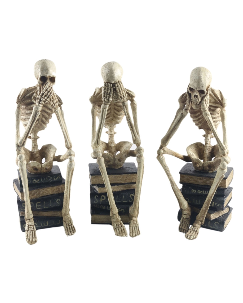 Unsere 3 sitzenden Skelett auf Bücher sind eine außergewöhnliche Idee als Deko für dein Bücherregal oder dein Fensterbrett. Die 3 Skelette sitzen jeweils auf einem Bücherstapel, die du auch einzeln platzieren kannst. Sie verkörpern die alte konfuzianische Weisheit „Nichts sehen, nichts hören, nichts sagen“, wobei ein Skelett seine leeren Augenhöhlen mit Skeletthänden abdeckt, das andere seine Ohren verschließt, während das dritte seinen grinsenden Kiefer zuhält.