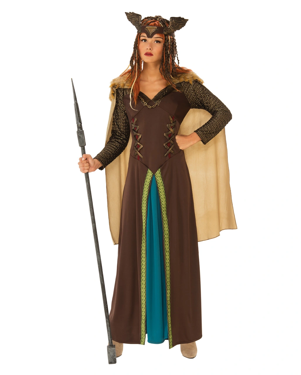 Das schlichte und doch sehr auffällige Kleid ist der absolute Hingucker auf jeder Karnevalsparty. Das kräftige Braun in Kombination mit goldenen Nähten und einem raffinierten Schnitt, zeigen optisch eine große Wirkung. Die Taille wird dadurch betont und der lange fließende blaue Stoff, der sich durch die hellgrünen Zierleisten vom braunen Stoff absetzt, ist eines der Details, die Deiner Figur schmeicheln. Das Kleid wirkt außerdem sehr hochwertig und ist bestimmt bald schon Dein Lieblingskostümkleid. Das angenähte beigefarbene Cape mit dem fellähnlichen Besatz flattert umher, wenn Du tanzt oder auf Beutezug gehst. Als Krönung des Wikinger Kriegein Damenkostüms setzt Du Dir noch den Kopfschmuck auf. Eine Mischung aus klassischem Brillenhelm und Diadem, natürlich mit den typischen hornähnlichen Aufsätzen, lässt Deinen Auftritt extravagant und außergewöhnlich erscheinen. Wie wäre es passend dazu mit einem Antiker Schild Spielzeugwaffe, falls Du Dich im Kampf verteidigen musst?